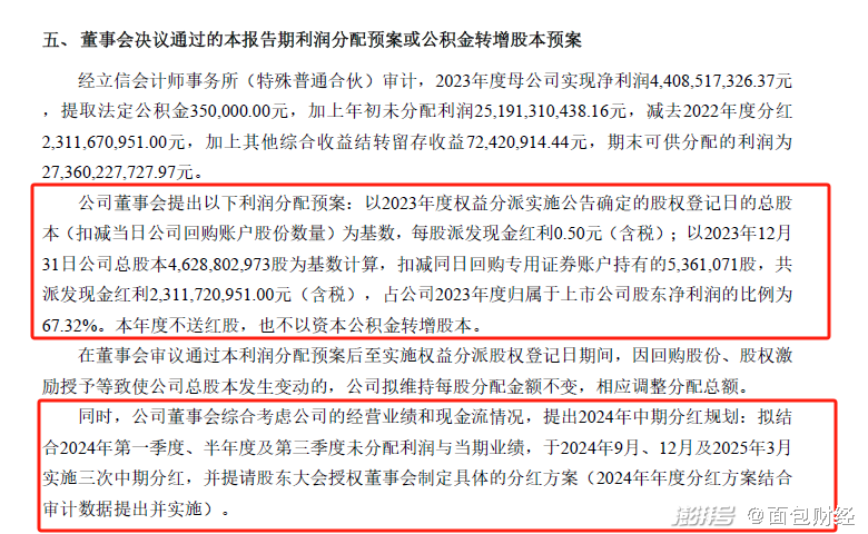 雅戈?duì)?023年年報(bào)顯示,公司董事會提出以下利潤分配預(yù)案:以2023年度權(quán)益分派實(shí)施公告確定的股權(quán)登記日的總股本(扣減當(dāng)日公司回購賬戶股份數(shù)量)為基數(shù),每股派發(fā)現(xiàn)金紅利0.50元(含稅);以2023年12月31日公司總股本4,628,802,973股為基數(shù)計(jì)算,扣減同日回購專用證券賬戶持有的5,361,071股,共派發(fā)現(xiàn)金紅利2,311,720,951.00元(含稅),占公司2023年度歸屬于上市公司股東凈利潤的比例為 67.32%。本年度不送紅股,也不以資本公積金轉(zhuǎn)增股本。